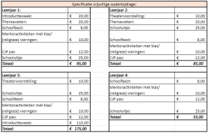 Komend schooljaar hebben we weer diverse culturele, sportieve en vooral leuke activiteiten voor onze leerlingen in de planning staan. Ook willen wij de leerlingen van extra materialen voorzien. Deze activiteiten en materialen brengen extra kosten met zich mee, die niet vallen onder de normale onderwijsbekostiging. In de bijlage vindt u een specificatie van deze kosten. Hiervoor vragen wij ouders/verzorgers een vrijwillige bijdrage.